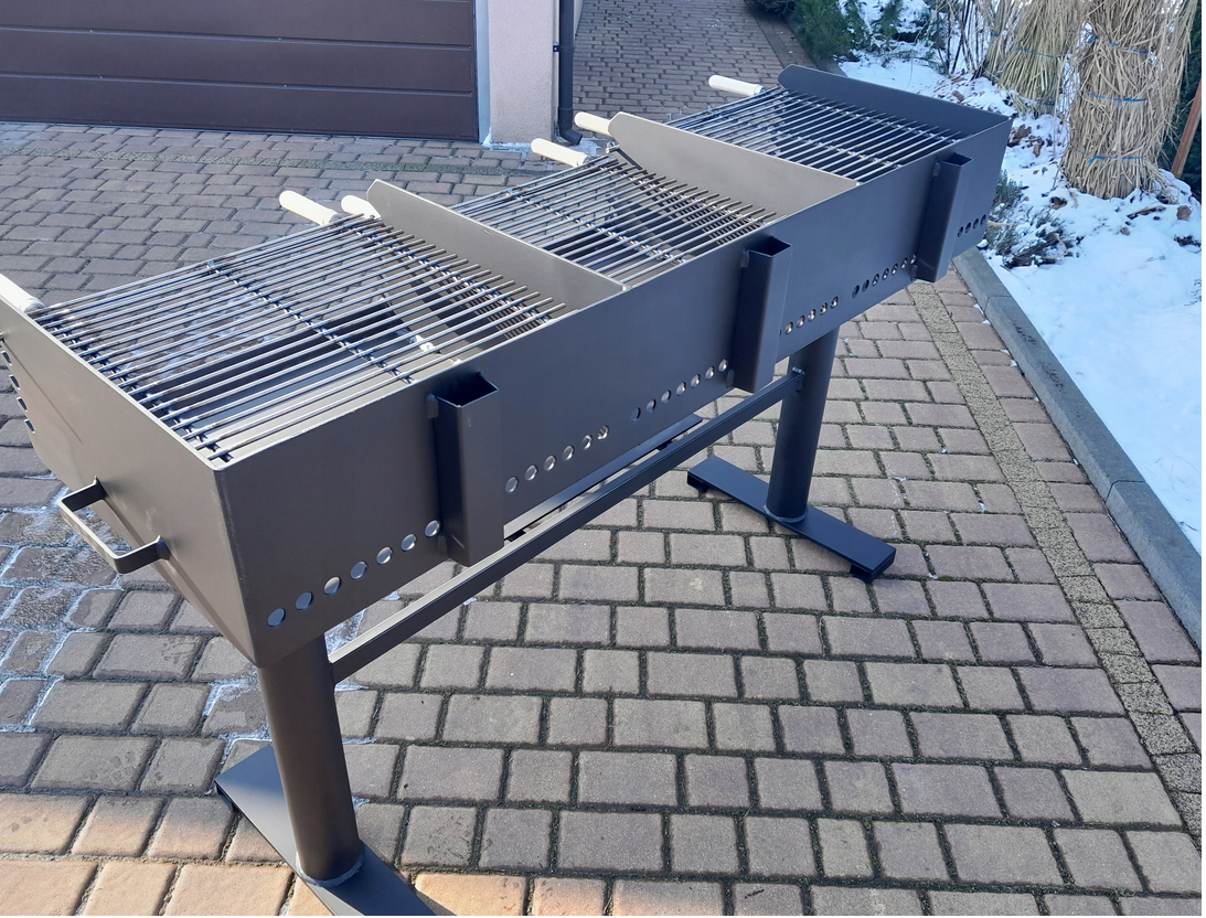 Grill posiada solidną, trwałą konstrukcję z wysokiej jakości stali, która zapewnia równomierny rozkład ciepła i efektywne grillowanie. Każde z trzech niezależnych stanowisk ma regulowaną wysokość rusztu, co umożliwia dostosowanie temperatury do różnych rodzajów potraw. Wyposażony w wygodne uchwyty.